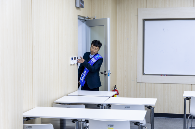 ▲소대현 부회장후보가 야간 수업을 듣는 학우들을 위해 미리 교실 불을 켜두고 있다.(사진: 손민기 기자)